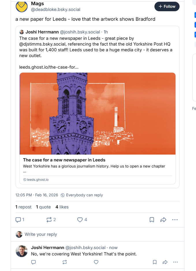 A few readers have asked us to clarify the geographic area we’re going to cover, so let me do that now. The new title will be based out of an office in Leeds; it’s the biggest population centre and where we’ll undoubtedly find a lot of our stories. But we will also cover stories right across West Yorkshire — Bradford, Calderdale, Kirkless and Wakefield (you may have spotted a slice of Bradford in our branding, we’ll be commissioning some more illustrations over time). In fact, today I’m heading to Slaithwaite, on the far western edge of this ceremonial county, for a tip I’ve been given there.