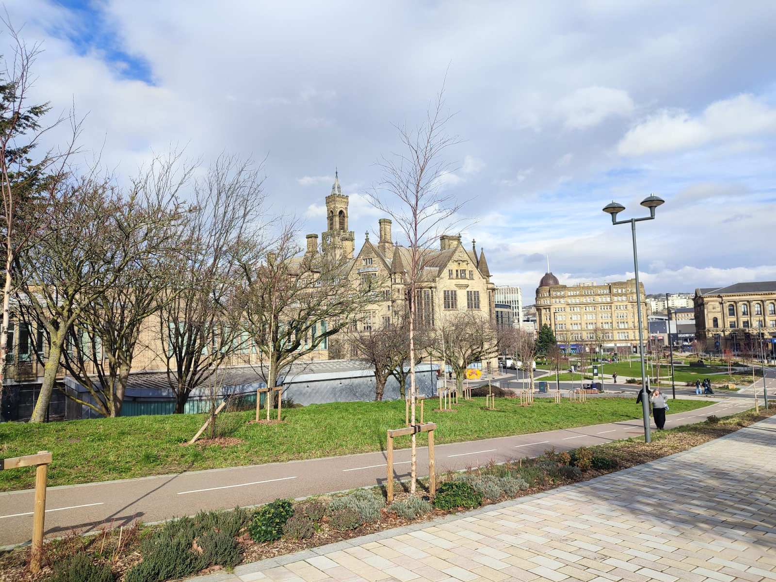 When I arrive in Bradford city centre, on a gorgeous spring day, I have to pinch myself. These are some incredible bike lanes. The smooth, gently winding path that wends around the City Hall, before easing upwards towards the Science and Media Museum, creates that perfect “desire line” effect, where you’re itching to get round the corner and see the next bit. It’s got little pockets of plants and saplings, which will one day cast it in dappled shade. It helps that the rest of the centre is pedestrianised, so you can hum along without fear of being knocked about. If this is what the CS1 is like, I think, I’m in for a treat.