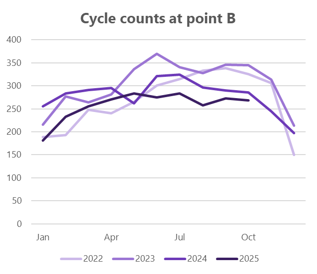 The dataset I’m interested in, optimistically titled “Leeds Annual Cycle Growth,” provides monthly updates for 26 cycle counters on the network, making it possible to track how busy the CS1 really is. Point A on the map above, just outside Bradford, typically sees 100-250 cyclists go past a day (counting both directions), depending on the time of year. That’s not nothing, but still pales in comparison to the number of cars barrelling past. More dishearteningly, the number of cyclists dipped in 2025. If cycling was taking off, you’d expect to see the opposite.